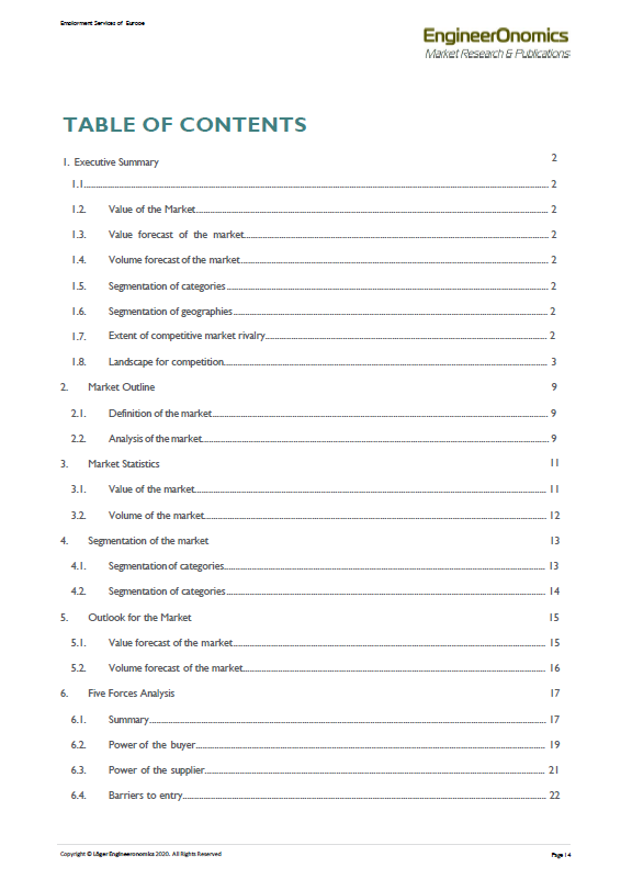 This 57 page industry report contains the latest extensive competitive intelligence analysis of the European Employment Services Industry. It features an in-depth coverage of the competitive power of different actor segments. Key players are suppliers, buyers, competitors, new entrants, and substitute product firms. Additionally, it contains an overview of economic data showing the industry market performance over the last 5 years, a statistical forecast for the coming 5 years, key annual financial ratios and key HR data as well as an overview of adopted business strategies of the main companies within the European Employment Services Industry. The report ends with a general outline of relevant macro-economic indicators and an overview of main trade Associations of the the Employmentservices industry of Europe.