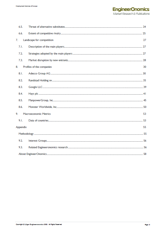 Keywords: Europe, employment services, competitive intelligence, market intelligence, industry insights, industry profitability, 5 forces analysis, buyer power, supplier power, barriers to entry, competitive rivalry, market volume, market sizing, market assessment, forecasting, foresight, predictive analytics, competitive landscape, competitive environment, threats of substitutes, United Kingdom, Germany, France, labor market, recruitment, temporary staffing, search & permanent placement, skills, talent pools, GDPR, online job boards, professional networks, Covid-19, strategic planning, business strategy, competitive strength, competitive advantage, competitive intensity, profiling, scoring, rating, threats and opportunities, strengths & weaknesses, SWOT, macroeconomics, political economy, statistics, data analytics, market entry, finance, competition, market opportunities, strategic positioning, developments, performance, business development, strategic alliances, strategic negotiations, bargaining power, sales, research quantitative research, qualitative research, interviewing, surveying, benchmarking, product development, research & development, mergers & acquisitions, pricing, data analytics, data science, segmentation, supply-demand, product development, innovation management, risk management, monitoring, equity research, investment research, portfolio management, geopolitics