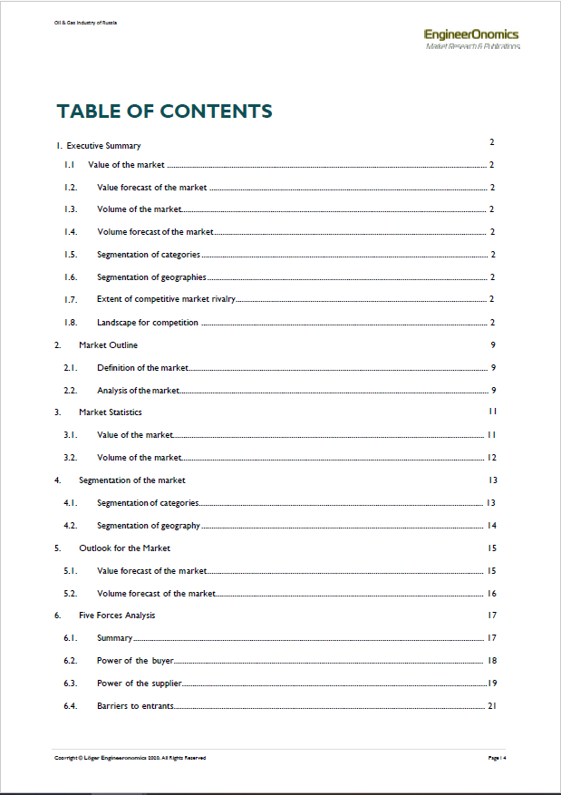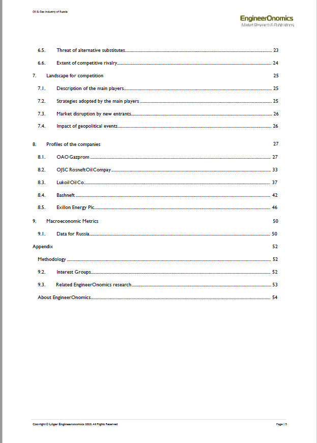 Keywords: Oil, Gas, Russia, competitive intelligence, market intelligence, industry insights, industry profitability, 5 forces analysis, buyer power, supplier power, barriers to entry, competitive rivalry, emerging markets, natural gas, crude oil, energy, exploration & production, distribution & transportation, commodities, electricity, environmental regulation, Covid-19, strategic planning, market volume, market sizing, market assessment, forecasting, foresight, predictive analytics, competitive landscape, competitive environment, threats of substitutes, business strategy, competitive strength, competitive advantage, competitive intensity, threats and opportunities, strengths & weaknesses, SWOT, macroeconomics, political economy, statistics, data analytics, market entry, finance, competition, market opportunities, strategic positioning, developments, performance, business development, strategic alliances, strategic negotiations, bargaining power, sales, research quantitative research, qualitative research, interviewing, surveying, benchmarking, product development, research & development, mergers & acquisitions, pricing, data analytics, data science, segmentation, supply-demand, product development, innovation management, risk