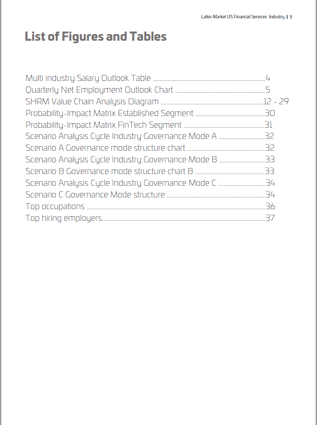 This 46 page report contains the coverage of our strategic forecast survey and assessment of the United States Financial Services labor market 2022 - 2027. It features our quantitative survey results in terms of key US financial services employment market metrics as well as advanced in-depth qualitative analysis. Our qualitative analysis includes an extensive and detailed Strategic Human Resource Management (SHRM) value chain analysis, Probability-Impact Matrix (PIM), Scenario Analysis, a multi-dimensional examination of the external business environment etc. Our quantitative assessment includes the current state of affairs as well as outlook projection in terms of salary growth expectations, top hiring industry segments, strategic transferrable competencies etc. This research and publication is produced for HRM practitioners, management consultants, investment strategists, L&D professionals, and last but not least career professionals. Our intelligence can be applied for purposes of strategic human resource planning, workforce planning, competency management, organizational design, career management, career planning etc.