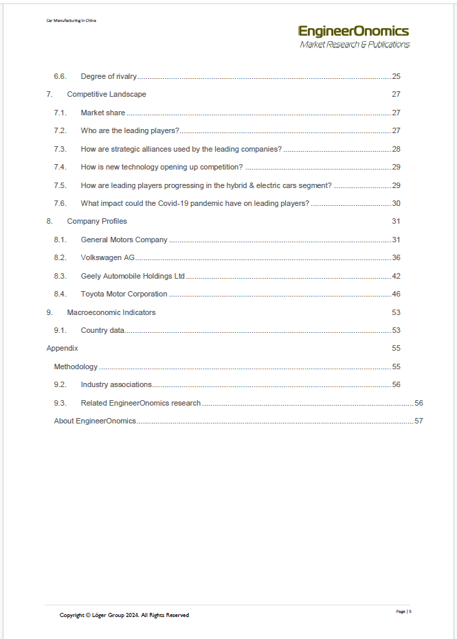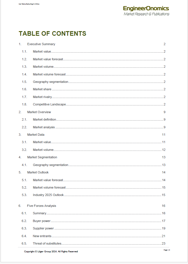 Our 57 page EngineerOnomics industry report contains the latest extensive competitive intelligence analysis and 2019-2025 Outlook of the China Car Manufacturing Industry. It features an in-depth coverage of the competitive power of different actor segments through our Five Forces Assessment. Key players are suppliers, buyers, competitors, new entrants, and substitute product players. We quantify the power of the most relevant underlying sources of each of these five forces such as switching costs, storage costs, barriers to entry etc, and present the scores of these multivariate drivers through a radar chart. Additionally, our report contains an overview of economic data showing the industry market performance over the last 5-6 years, a statistical forecast for the coming 5 years, a qualitative outlook for the year 2025, key annual financial ratios, key HR data as well as an overview of adopted business strategies of the main companies within the China Car Manufacturing Industry, including a brief geo-political analysis. The report ends with a general outline of relevant macro-economic indicators and an overview of the main trade associations of the Germany Car Manufacturing Industry.
