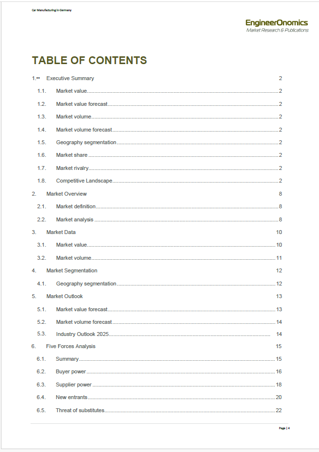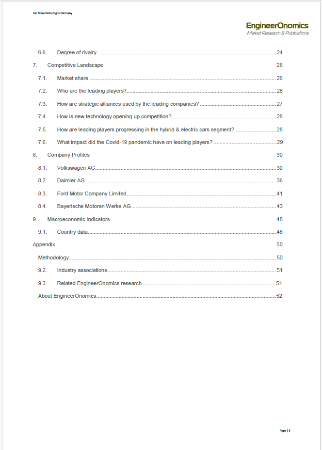 Our 52 page EngineerOnomics industry report contains the latest extensive competitive intelligence analysis and 2021-2025 Outlook of the Germany Car Manufacturing Industry. It features an in-depth coverage of the competitive power of different actor segments through our Five Forces Assessment. Key players are suppliers, buyers, competitors, new entrants, and substitute product players. We quantify the power of the most relevant underlying sources of each of these five forces such as switching costs, storage costs, barriers to entry etc, and present the scores of these multivariate drivers through a radar chart. Additionally, our report contains an overview of economic data showing the industry market performance over the last 5 years, a statistical forecast for the coming 5 years, a qualitative outlook for the year 2025, key annual financial ratios, key HR data as well as an overview of adopted business strategies of the main companies within the Germany Car Manufacturing Industry, including a brief geo-political analysis. The report ends with a general outline of relevant macro-economic indicators and an overview of the main trade associations of the Germany Car Manufacturing Industry.