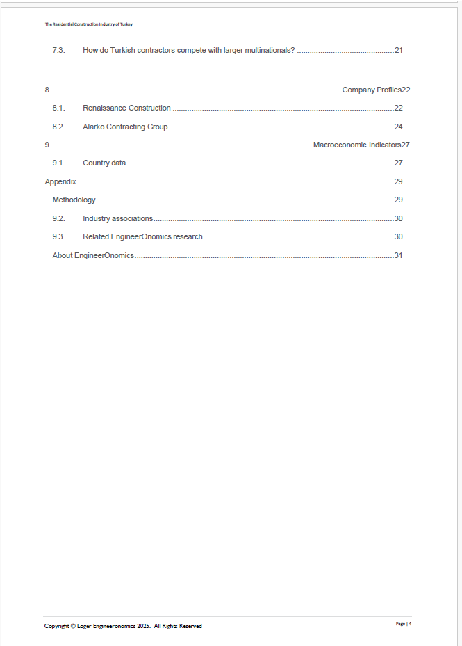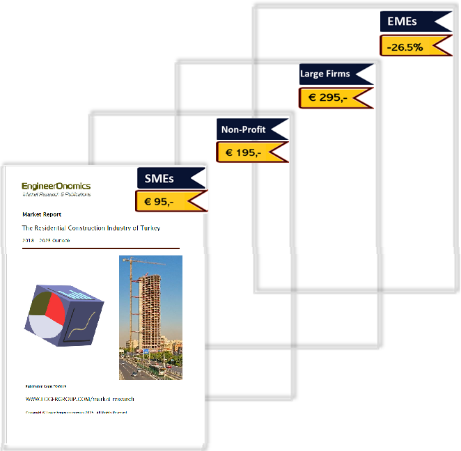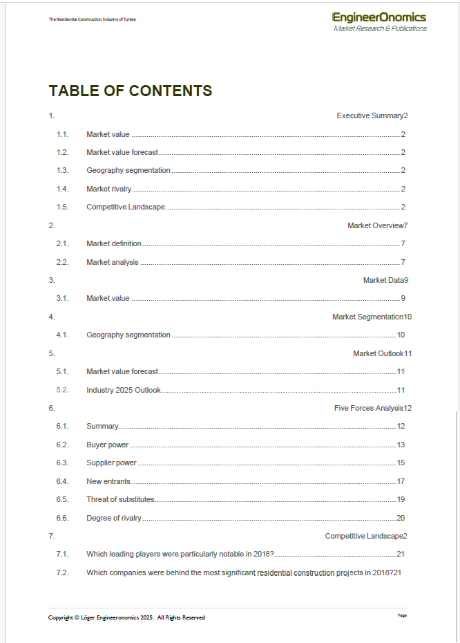 Our 31 page EngineerOnomics industry report contains the latest extensive competitive intelligence analysis and 2018-2025 Outlook of the Turkey Residential Construction Industry. It features an in-depth coverage of the competitive power of different actor segments through our Five Forces Assessment. Key players are suppliers, buyers, competitors, new entrants, and substitute product players. We quantify the power of the most relevant underlying sources of each of these five forces such as switching costs, storage costs, barriers to entry etc, and present the scores of these multivariate drivers through a radar chart. Additionally, our report contains an overview of economic data showing the industry market performance over the last 5-6 years, a statistical forecast for the coming 5 years, a qualitative outlook for the year 2025, key annual financial ratios, key HR data as well as an overview of adopted business strategies of the main companies within the Turkey Residential Construction Industry, including a brief geo-political analysis. The report ends with a general outline of relevant macro-economic indicators and an overview of the main trade
