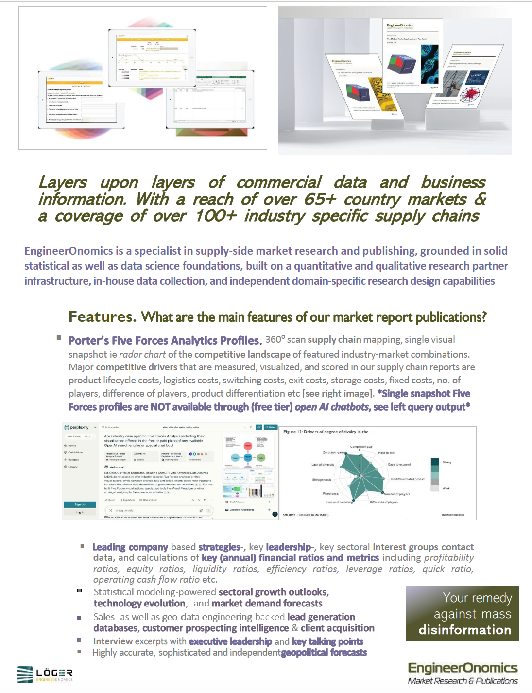 EngineerOnomics Market Research & Publications© , part of Löger Group, is specialized in the in-house development and sales of proprietary industry-market reports that deliver competitive intelligence, strategic positioning, and bargaining power to Small- and Medium Sized businesses, Emerging Market Country firms, and beyond. Our reports contain our widely acclaimed Porter's five forces analyses, industry economic forecasts, and key financial ratios about the main players of an industry. Featured economic sectors include engineering intensive and business services oriented industries within a variety of regions.