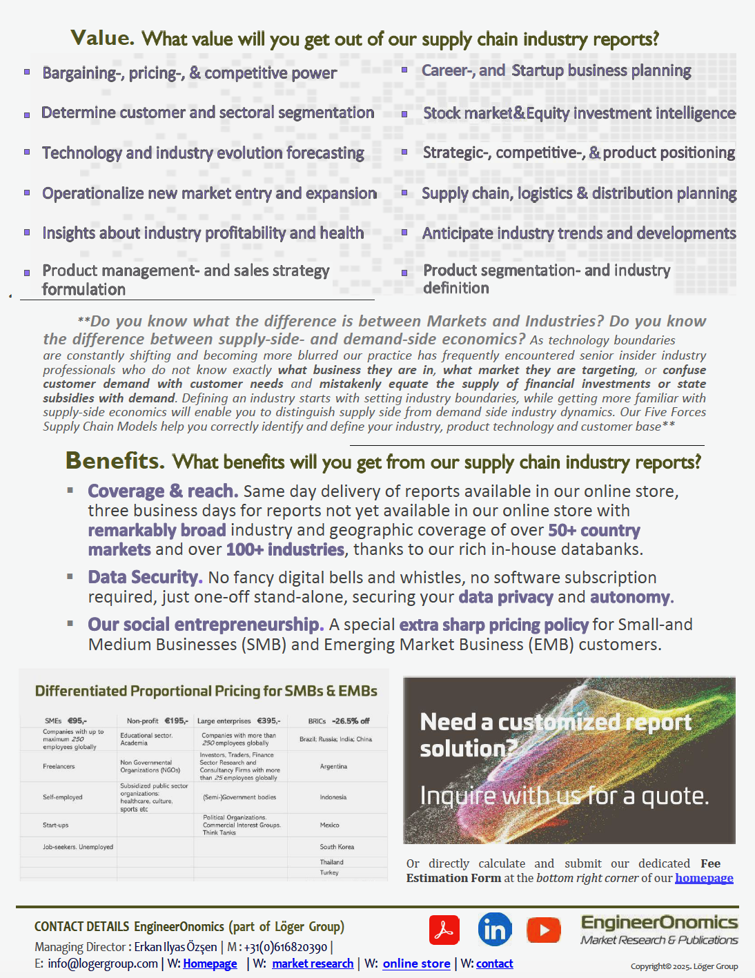 EngineerOnomics Market Research & Publications© , part of Löger Group, is specialized in the continious proprietary development and sales of proprietary industry-market reports that deliver competitive intelligence, strategic positioning, and bargaining power to Small- and Medium Sized businesses, Emerging Market Country firms, and beyond. Our reports contain our widely acclaimed Porter's five forces analyses, industry economic forecasts, and key financial ratios about the main players of an industry. Featured economic sectors include engineering intensive and business services oriented industries within a variety of regional markets. Additionally , we publish strategic labor market- as well as career management studies that contain avanced - commercial data driven - strategic mapping, forecasting, scenario assessment, Strategic Human Resource Management (SHRM) and Innovation Manageement (IM), profiling analyses etc.