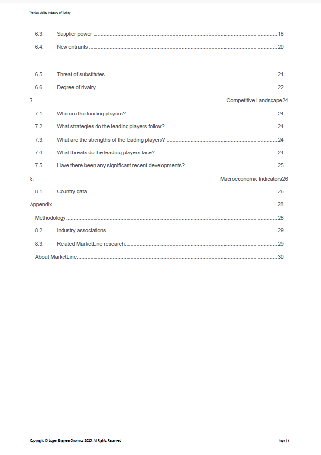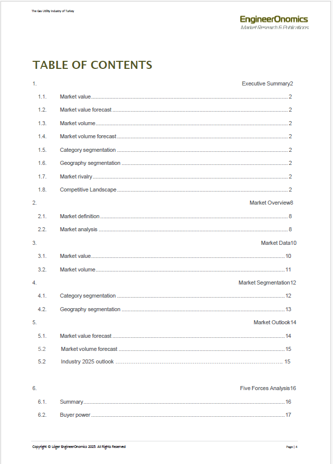 Our 30 page EngineerOnomics industry report contains the latest extensive competitive intelligence analysis and 2018-2025 Outlook of the Turkey GAS Utility Industry. It features an in-depth coverage of the competitive power of different actor segments through our Five Forces Assessment. Key players are suppliers, buyers, competitors, new entrants, and substitute product players. We quantify the power of the most relevant underlying sources of each of these five forces such as switching costs, storage costs, barriers to entry etc, and present the scores of these multivariate drivers through a radar chart. Additionally, our report contains an overview of economic data showing the industry market performance over the last 5-6 years, a statistical forecast for the coming 5 years, a qualitative outlook for the year 2025, key annual financial ratios, key HR data as well as an overview of adopted business strategies of the main companies within the Turkey GAS Utility Industry, including a brief geo-political analysis. The report ends with a general outline of relevant macro-economic indicators and an overview of the main trade