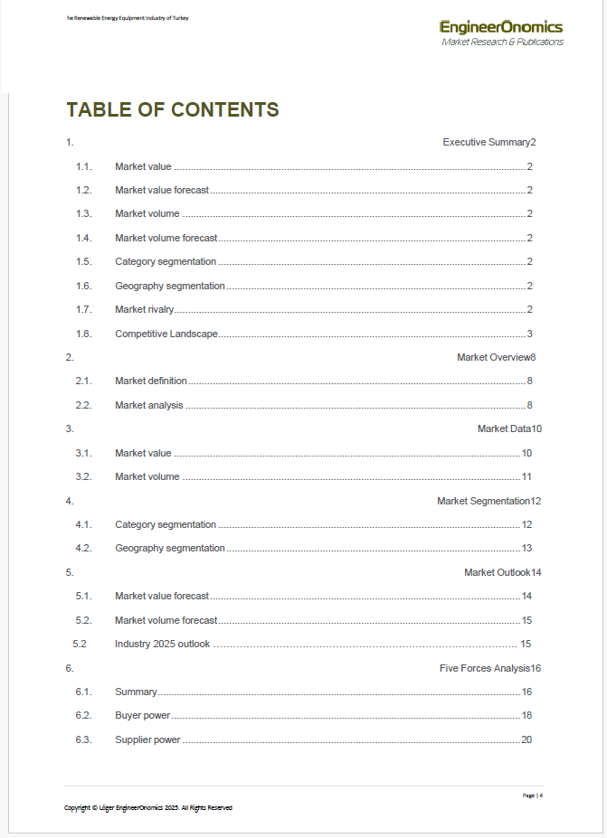 Keywords: Renewables, Energy, Power, Sustainability, CleanTech, GreenTech, Wind Energy, Wind Turbines, Solar Energy, PV, Hydroelectrics, Hydrogen, Graphene, Microgrids, Selfgeneration, Electric Vehicles, Turkey, Turkish, Marmara region, competitive intelligence, market intelligen ce, industry insights, industry profitability, 5 forces analysis, five forces, buyer power, supplier power, barriers to entry, competitive rivalry, emerging markets, batteries, Covid-19, strategic planning, market volume, market sizing, market assessment, forecasting, foresight, predictive analytics, competitive landscape, competitive environment, threats of substitutes, business strategy, competitive strength, competitive advantage, competitive intensity, threats and opportunities, strengths & weaknesses, SWOT, macroeconomics, political economy, statistics, data analytics, market entry, finance, competition, market opportunities, strategic positioning, developments, performance, business development, strategic alliances, strategic negotiations, bargaining power, sales, research quantitative research, qualitative research, interviewing, surveying, benchmarking, product development, research & development, mergers & acquisitions, pricing, data analytics, data science, segmentation, supply-demand, product development, innovation management, risk