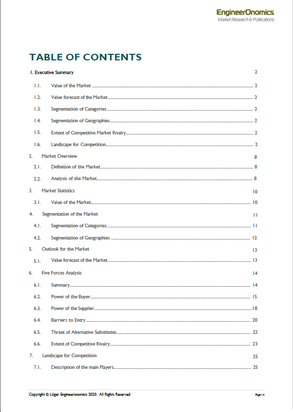 EngineerOnomics Market Research & Publications© , part of Löger Group, is specialized in the in-house development and sales of proprietary industry-market reports that deliver competitive intelligence, strategic positioning, and bargaining power to Small- and Medium Sized businesses, Emerging Market Country firms, and beyond. Our reports contain our widely acclaimed Porter's five forces analyses, industry economic forecasts, and key financial ratios about the main players of an industry. Featured economic sectors include engineering intensive and business services oriented industries within a variety of regions.