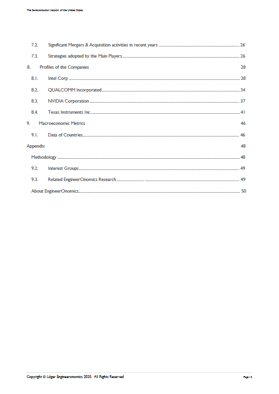Keywords: Semiconductor, United States, competitive intelligence, market intelligence, industry insights, industry profitability, 5 forces analysis, buyer power, supplier power, barriers to entry, competitive rivalry, electronics, fabrication, wafer, autonomous driving, Electric Vehicles, Artificial Intelligence, microcontrollers, manufacturing, Virtual Reality, 5G, mobile phones, wireless telecommunication, Covid-19, strategic planning, market volume, market sizing, market assessment, forecasting, foresight, predictive analytics, competitive landscape, competitive environment, threats of substitutes, business strategy, competitive strength, competitive advantage, competitive intensity, profiling, rating, scoring, threats and opportunities, strengths & weaknesses, SWOT, macroeconomics, political economy, statistics, data analytics, market entry, finance, competition, market opportunities, strategic positioning, developments, performance, business development, strategic alliances, strategic negotiations, bargaining power, sales, research quantitative research, qualitative research, interviewing, surveying, benchmarking, product development, research & development, mergers & acquisitions, pricing, data analytics, data science, segmentation, supply-demand, product development, innovation management, risk management, monitoring, equity
